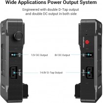 SALIDA DUAL D-TAP Y DC: El adaptador de batería proporciona un V mount para una sola batería de V mount y está equipado con dos salidas D-Tap de 14,8 V, una salida de 8 V CC, una salida de 12 V CC que puede alimentar hasta 4 dispositivos, como cámara, monitor, transmisor, seguimiento de enfoque, teléfono móvil, etc.