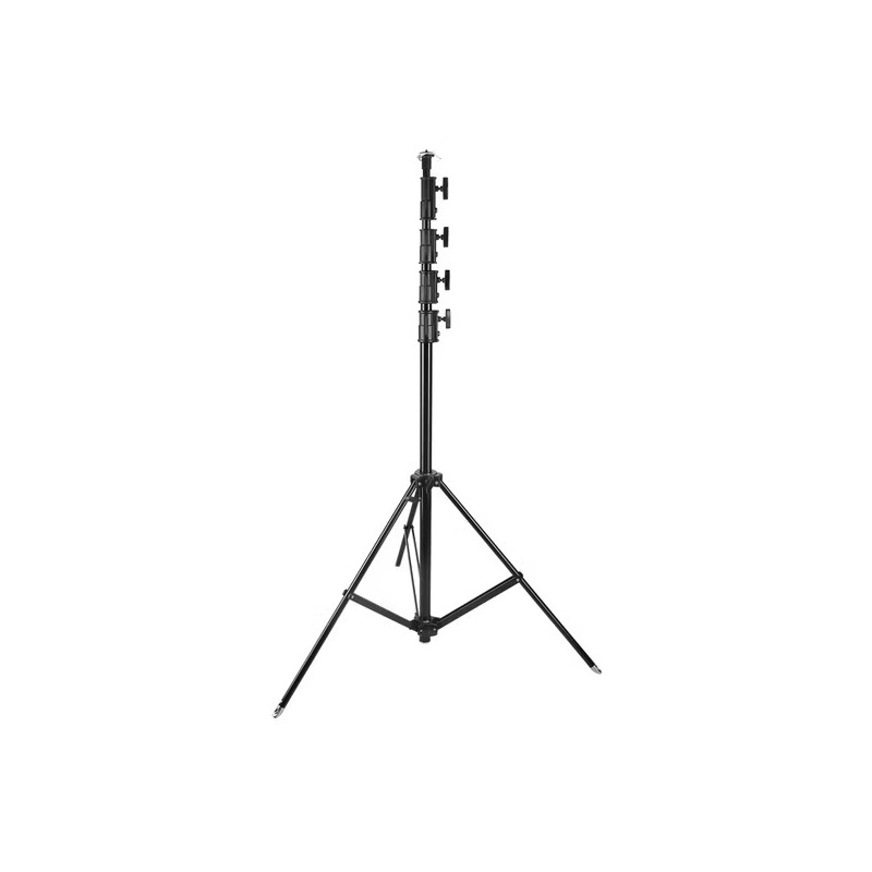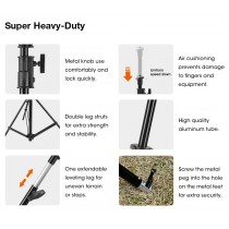 El soporte de aluminio E-IMAGE NEW LS-PRO80 Super High puede sostener tu cámara hasta 6.3 metros de altura. A su máxima altura, soportará una carga de 5 kg/11 lbs. También cuenta con una pata niveladora extensible para terrenos irregulares. En la parte superior, hay una placa triangular que puede enganchar los kits de cables de refuerzo contra el viento, y el clavo estabilizador se puede atornillar en el agujero de cada pata de metal, utilizado para proporcionar una alta estabilidad.