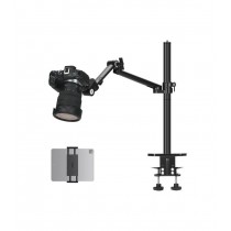El brazo articulado se monta sobre el soporte vertical, puede deslizarse hacia arriba y hacia abajo, y se extiende hasta 48cm de largo. La rótula incluida permite montar una cámara o accesorio usando el tornillo manual de 1/4"-20.