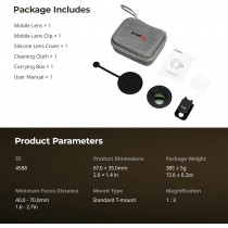 El paquete incluye: 1 lente móvil, 1 clip para lente móvil, 1 funda de silicona para lentes, 1 paño de limpieza, 1 bolsa de almacenamiento