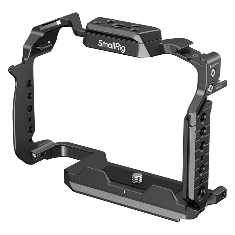 También incluye dos soportes de zapata fría para acoplar el micrófono, una luz de vídeo LED; un raíl OTAN superior para el asa superior opcional SmallRig 4483; un raíl OTAN izquierdo para el asa lateral opcional SmallRig 4485; y una toma QD inferior para instalar una correa de hombro QD. En la parte inferior hay una placa de liberación rápida Arca-Swiss, adecuada para cardanes DJI RS 2/ RSC 2 / RS 3 / RS 3 Pro / RS 4 / RS 4 Pro y trípodes Arca-Swiss, así como un orificio roscado para la placa de liberación rápida Arca-Swiss 3154. El artículo también tiene orificios para cinturón a ambos lados y en la parte inferior, que son compatibles con la correa de mano opcional SmallRig 3848, la correa de hombro PSC2428, etc. Además, se incluye una llave hexagonal magnética para facilitar el desmontaje y el montaje.