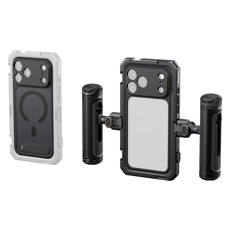【Kit de cámara dual】: El soporte de video para teléfono SmallRig 5541 está especialmente diseñado para el iPhone 17 Pro Max, lo que facilita la grabación de video profesional, la en vivo y la filmación en dispositivos móviles. Este kit incluye una funda para teléfono, una jaula de video, un asa lateral giratoria con control inalámbrico y una carcasa de TPU suave, todo para el iPhone 17 Pro Max.